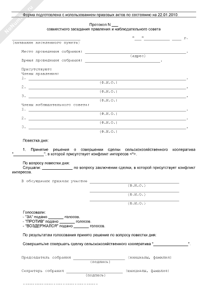 - 1335Протокол совместного заседания правления и наблюдательного совета сельскохозяйственного кооператива по вопросу совершения сделки, в отношении которой имеется конфликт интересов