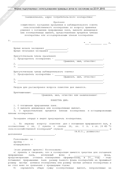 - 1336Протокол совместного заседания правления и наблюдательного совета сельскохозяйственного кооператива по вопросу принятия решения о погашении приращенных паев, выплате дивидендов или кооперативных выплат, предоставлении кредитов членам кооператива или ассоциированным членам кооператива