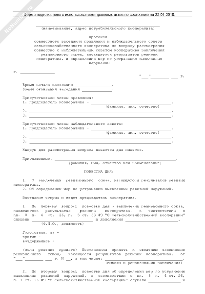- 1337Протокол совместного заседания правления и наблюдательного совета сельскохозяйственного кооператива по вопросу рассмотрения совместно с наблюдательным советом кооператива заключения ревизионного союза, касающегося результатов ревизии кооператива, и определения мер по устранению выявленных нарушений