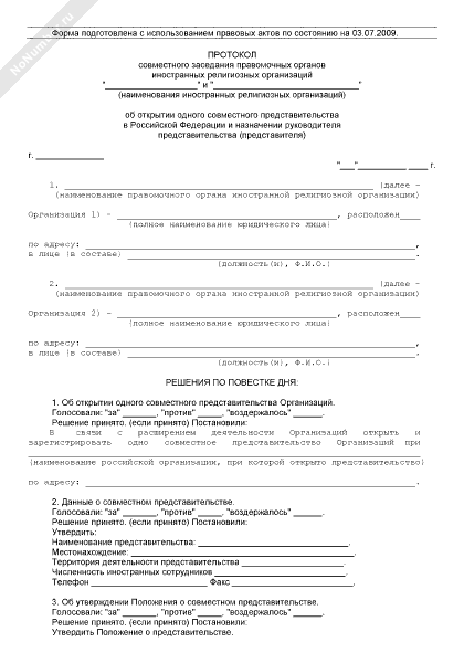 - 1333Протокол совместного заседания правомочных органов иностранных религиозных организаций об открытии одного совместного представительства в Российской Федерации и назначении руководителя представительства (представителя)