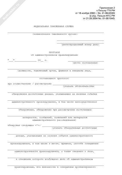Протокол должностного лица таможенного органа об административном правонарушении в присутствии лица, в отношении которого ведется производство по делу (рекомендуемый образец заполнения)