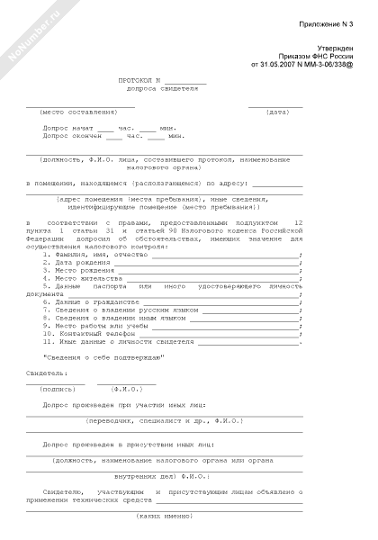 Протокол допроса свидетеля об обстоятельствах, имеющих значение для осуществления налогового контроля (рекомендуемый образец заполнения)