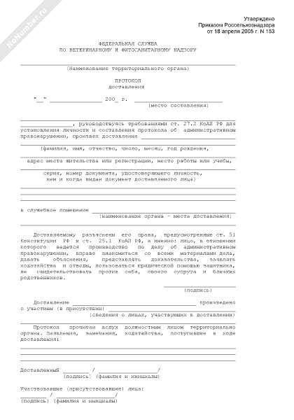 Протокол доставления лица в служебное помещение территориального органа Россельхознадзора для составления протокола об административном нарушении (рекомендуемый образец заполнения)