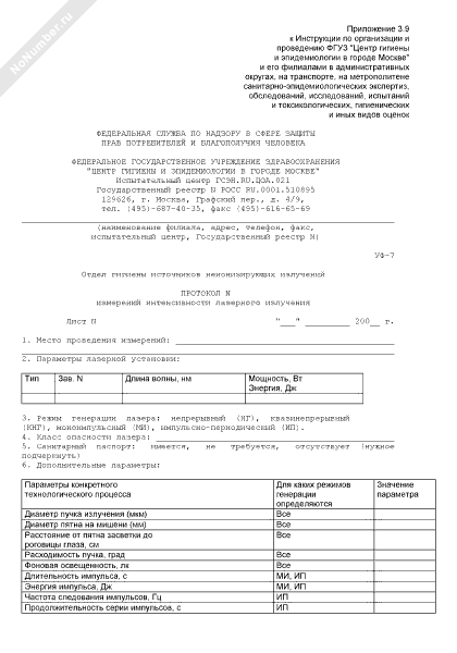 Протокол измерений интенсивности лазерного излучения. Форма № УФ-7