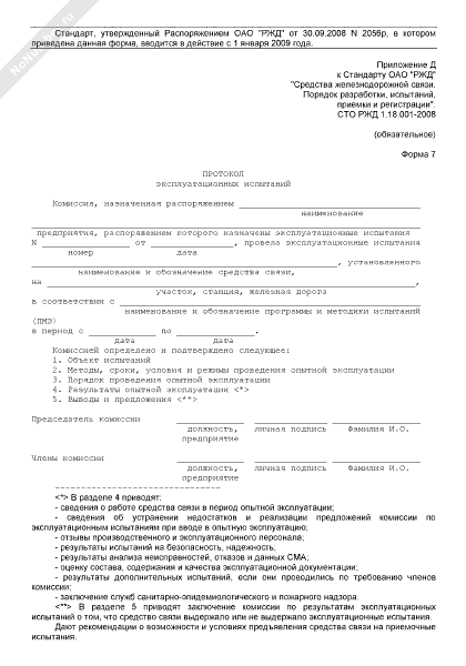 Протокол эксплуатационных испытаний средств железнодорожной связи (форма № 7)
