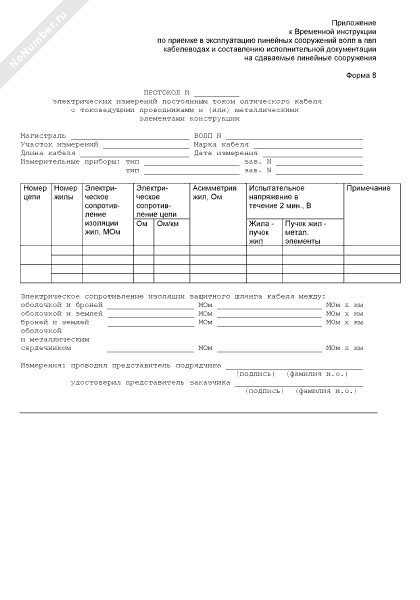 Протокол электрических измерений постоянным током оптического кабеля с токоведущими проводниками и (или) металлическими элементами конструкции (форма № 8)