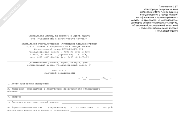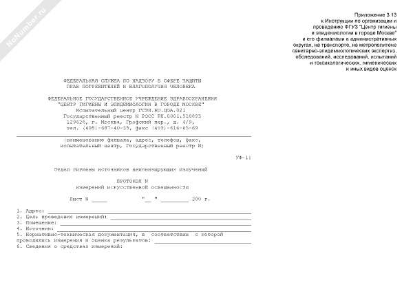 Протокол измерений искусственной освещенности. Форма № УФ-11