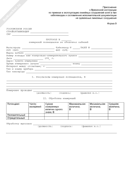 Протокол измерений потенциалов на оболочках кабелей (форма № 9)