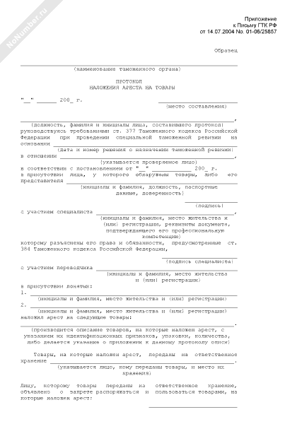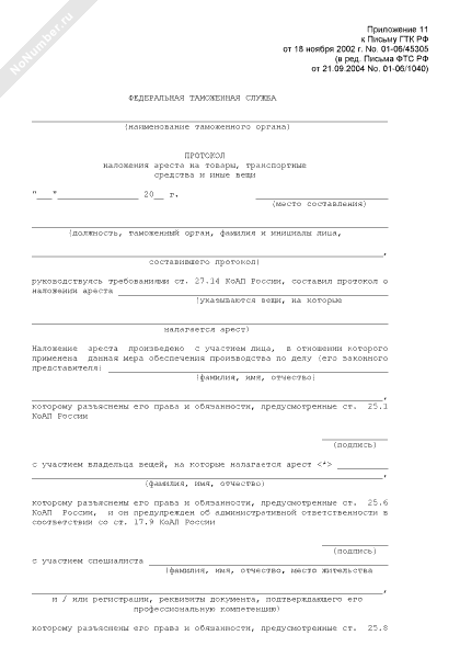 Протокол наложения ареста на товары, транспортные средства и иные вещи