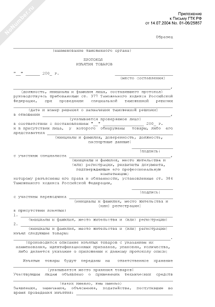 Протокол об изъятии товаров при проведении таможенной ревизии
