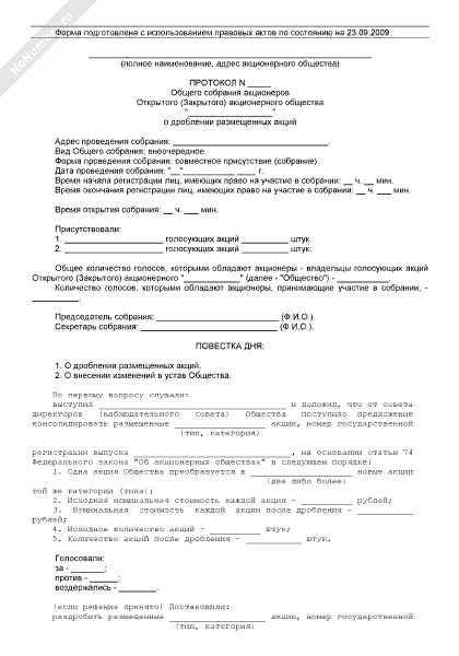 Протокол общего собрания акционеров о дроблении размещенных акций