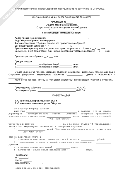 Протокол общего собрания акционеров о консолидации размещенных акций