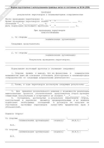 Протокол результатов переговоров о взаимовыгодном сотрудничестве (рекомендуемый образец заполнения)