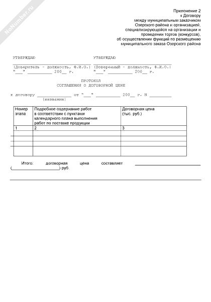 Протокол соглашения о договорной цене (приложение к договору между муниципальным заказчиком Озерского района и организацией, специализирующейся на организации и проведении торгов (конкурсов), об осуществлении функций по размещению муниципального заказа Озерского района Московской области)