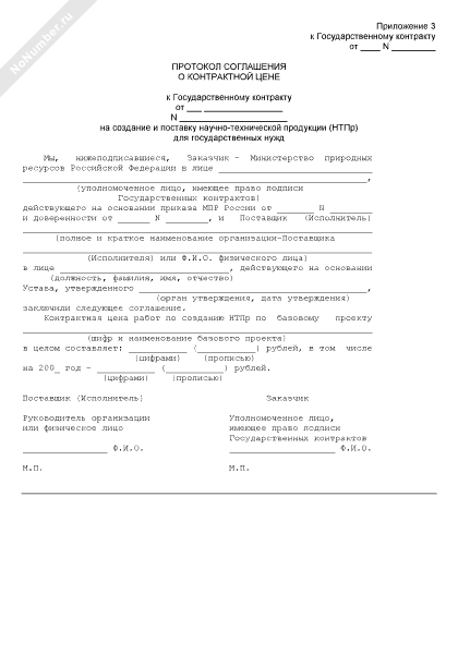 Протокол соглашения о контрактной цене (приложение к государственному контракту на создание и поставку научно-технической продукции (НТПР) для государственных нужд МПР России)