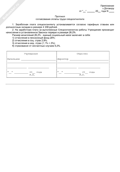 Протокол согласования оплаты труда спецконтингента (приложение к договору о предоставлении рабочей силы из числа осужденных)