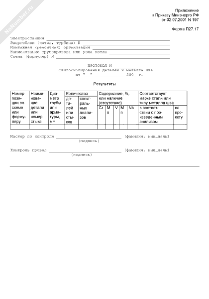 Протокол стилоскопирования деталей и металла шва. Форма № П27.17 (рекомендуемый образец заполнения)