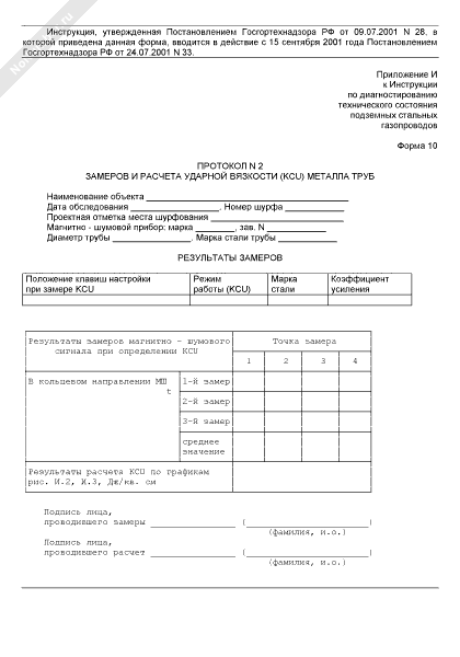 Протокол замеров и расчета ударной вязкости (KCU) металла труб (форма № 10)