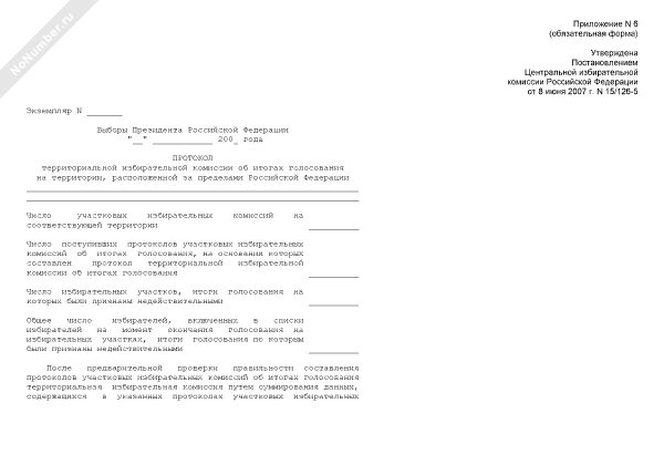 Протокол территориальной избирательной комиссии об итогах голосования при проведении выборов Президента Российской Федерации на территории, расположенной за пределами Российской Федерации (обязательная форма)
