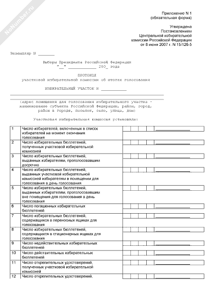 Протокол участковой избирательной комиссии об итогах голосования при проведении выборов Президента Российской Федерации на избирательном участке (обязательная форма)