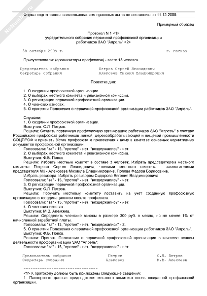 Протокол учредительного собрания первичной профсоюзной организации работников (рекомендуемый образец заполнения)