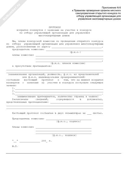 Протокол вскрытия конвертов с заявками на участие в конкурсе по отбору управляющей организации для управления многоквартирным домом (рекомендуемый образец заполнения)