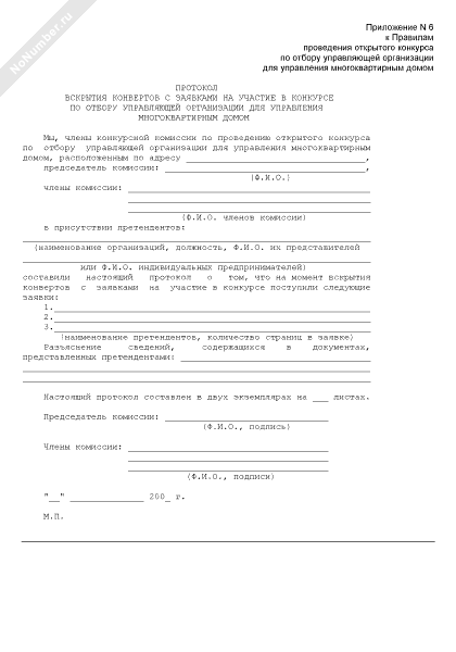 Протокол вскрытия конвертов с заявками на участие в конкурсе по отбору управляющей организации для управления многоквартирным домом на территории города Протвино (рекомендуемый образец заполнения)