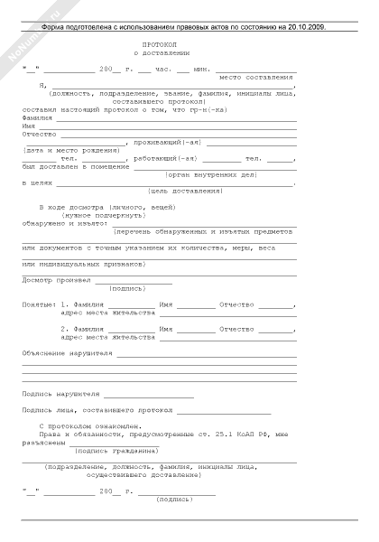 Протокол о доставлении гражданина в помещение органов внутренних дел
