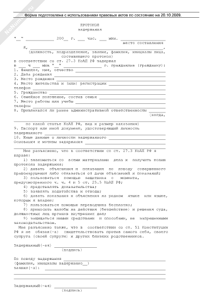 Протокол задержания гражданина за совершенное административное правонарушение (рекомендуемый образец заполнения)