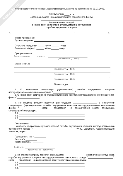 Протокол заседания совета негосударственного пенсионного фонда о назначении контролера (руководителя) и сотрудников службы внутреннего контроля