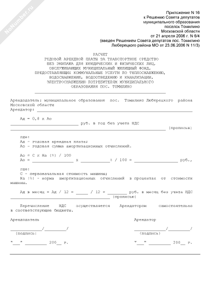 - 201Расчет годовой арендной платы за транспортное средство без экипажа для юридических и физических лиц, обслуживающих муниципальный жилищный фонд, предоставляющих коммунальные услуги по теплоснабжению, водоснабжению, водоотведению и канализации, электроснабжению потребителям муниципального образования поселка Томилино Московской области