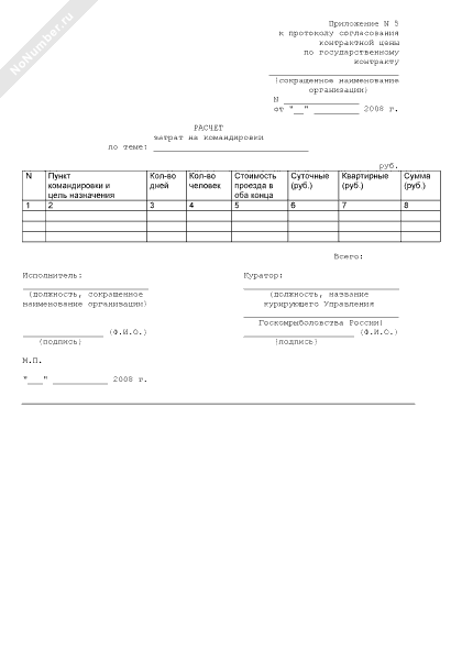- 252Расчет затрат на командировки (приложение к протоколу согласования контрактной цены по государственному контракту на выполнение в 2008 году научно-исследовательских и опытно-конструкторских работ по направлению «Проведение исследований в области экономики и управления рыбохозяйственным комплексом» для нужд госкомрыболовства России)