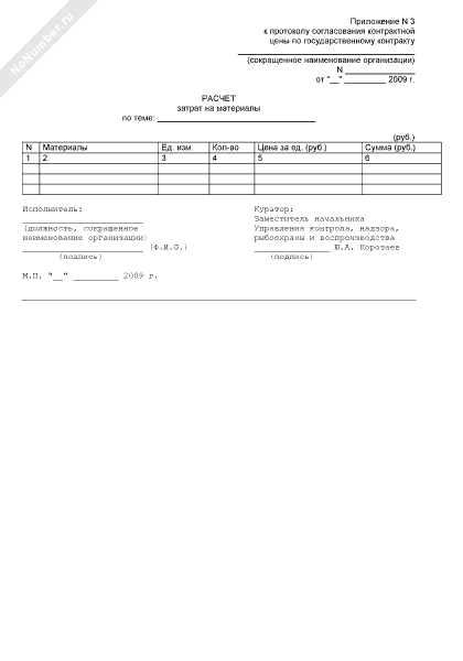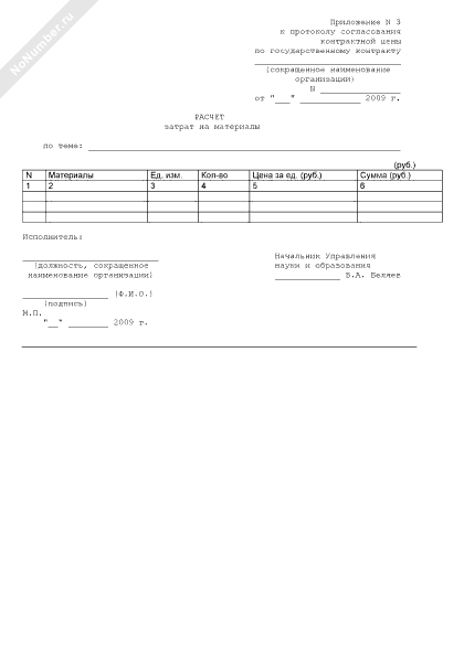 - 259Расчет затрат на материалы (приложение к протоколу согласования контрактной цены по государственному контракту на выполнение в 2009 году научно-исследовательских и опытно-конструкторских работ по направлению «Научное обеспечение мероприятий по разработке нормативов расходов на осуществление мероприятий по охране водных биоресурсов и среды их обитания, искусственному воспроизводству водных биоресурсов, акклиматизации и рыбохозяйственной мелиорации» для нужд Федерального агентства по рыболовству)