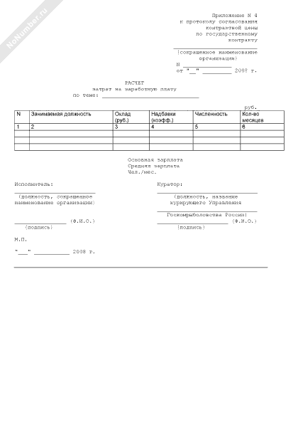 - 251Расчет затрат на заработную плату (приложение к протоколу согласования контрактной цены по государственному контракту на выполнение в 2008 году научно-исследовательских и опытно-конструкторских работ по направлению «Проведение исследований в области экономики и управления рыбохозяйственным комплексом» для нужд госкомрыболовства России)