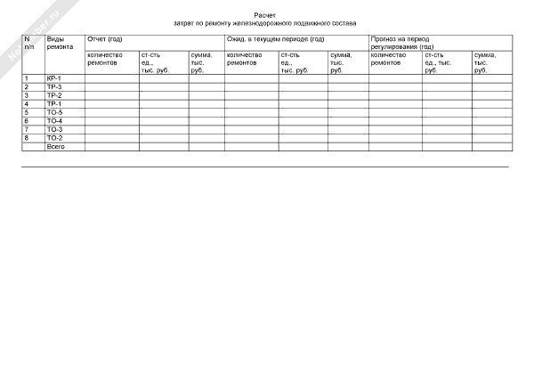 - 284Расчет затрат по ремонту железнодорожного подвижного состава, учитываемых при формировании цен (тарифов) на услуги субъектов естественных монополий в сфере перевозок пассажиров железнодорожным транспортом общего пользования в пригородном сообщении в субъектах Российской Федерации