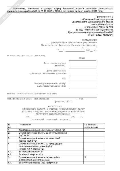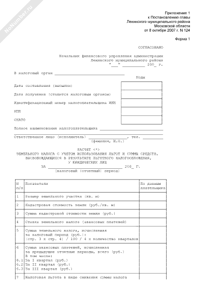 - 288Расчет земельного налога с учетом использования льгот и суммы средств, высвобождающихся в результате льготного налогообложения, у юридических лиц Ленинского муниципального района Московской области (форма № 1)