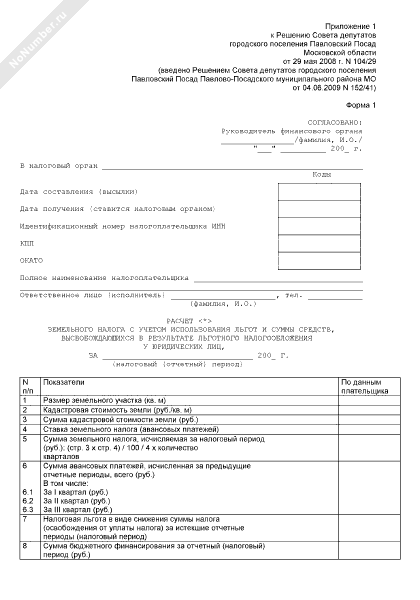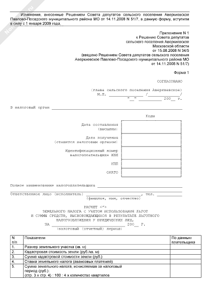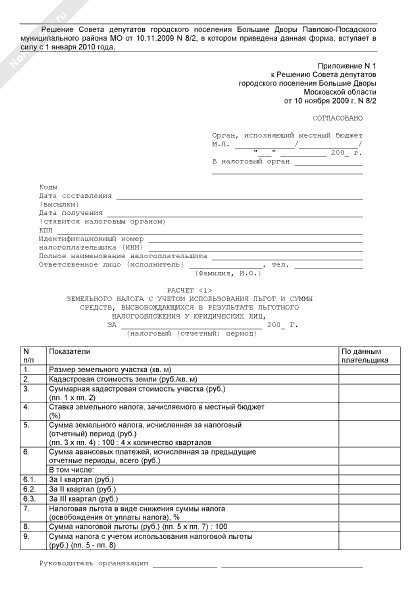 - 290Расчет земельного налога с учетом использования льгот и суммы средств, высвобождающихся в результате льготного налогообложения у юридических лиц в городском поселении Павловский Посад Павлово-Посадского муниципального района Московской области (форма № 1)