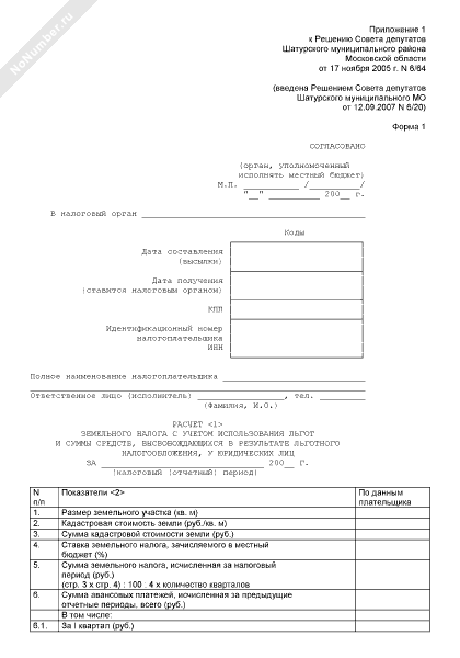 - 291Расчет земельного налога с учетом использования льгот и суммы средств, высвобождающихся в результате льготного налогообложения, у юридических лиц на территории Шатурского муниципального района Московской области (форма № 1)