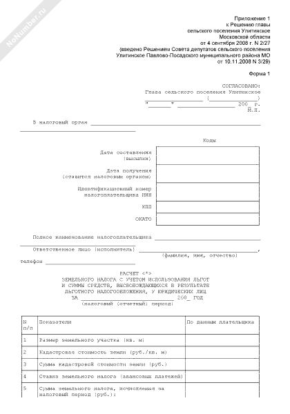 - 294Расчет земельного налога с учетом использования льгот и суммы средств, высвобождающихся в результате льготного налогообложения, у юридических лиц на территории сельского поселения Улитинское Павлово-Посадского муниципального района Московской области (форма № 1)
