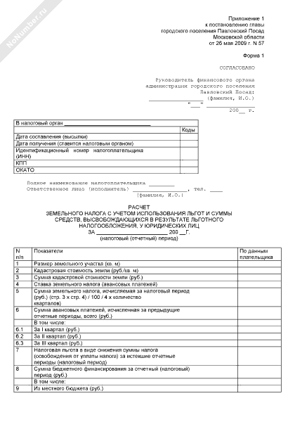 - 298Расчет земельного налога с учетом использования льгот и суммы средств, высвобождающихся в результате льготного налогообложения, у юридических лиц городского поселения Павловский Посад Павлово-Посадского муниципального района Московской области (форма № 1)