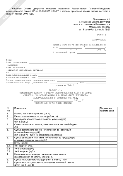 - 295Расчет земельного налога на территории сельского поселения Рахмановское Павлово-Посадского муниципального района с учетом использования льгот и суммы средств, высвобождающихся в результате льготного налогообложения у юридических лиц (форма № 1)