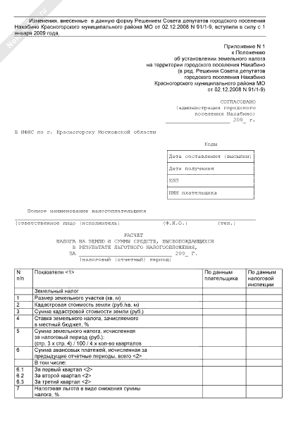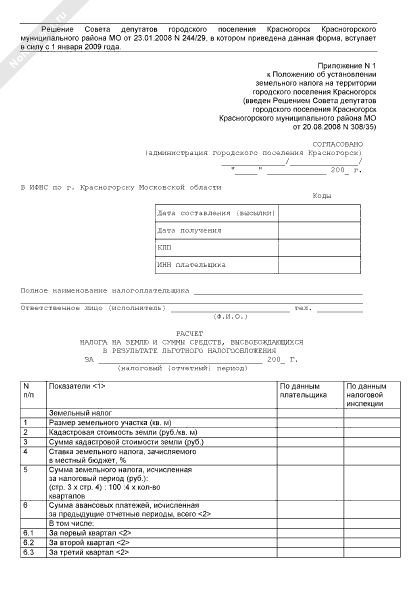 - 439Расчет налога на землю и суммы средств, высвобождающихся в результате льготного налогообложения на территории городского поселения Красногорск Московской области