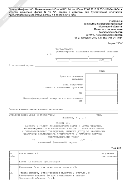 - 482Расчет налогов с учетом использования льгот и суммы средств, высвобождающихся в результате льготного налогообложения у образовательных учреждений Московской области, имеющих доход от реализации продукции собственного производства и оказания платных образовательных услуг. Форма № 15 «а»
