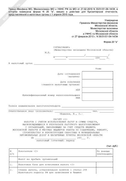 - 485Расчет налогов с учетом использования льгот и суммы средств, высвобождающихся в результате льготного налогообложения у организаций, выполняющих за счет средств бюджета Московской области и местных бюджетов работы по содержанию, ремонту, строительству и реконструкции областных и муниципальных автомобильных дорог в населенных пунктах Московской области. Форма № 20 «а»