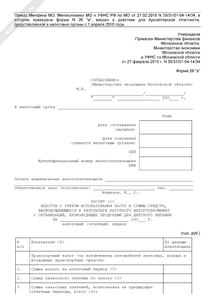 - 488Расчет налогов с учетом использования льгот и суммы средств, высвобождающихся в результате льготного налогообложения у организаций Московской области, производящих продукцию для детского питания. Форма № 26 «а»