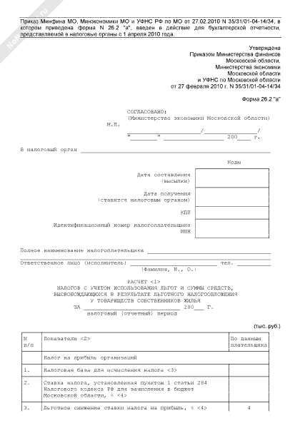 - 490Расчет налогов с учетом использования льгот и суммы средств, высвобождающихся в результате льготного налогообложения у товариществ собственников жилья в Московской области. Форма № 26.2 «а»