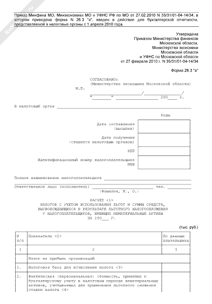 - 491Расчет налогов с учетом использования льгот и суммы средств, высвобождающихся в результате льготного налогообложения у налогоплательщиков, имеющих нематериальные активы. Форма № 26.3 «а»