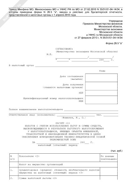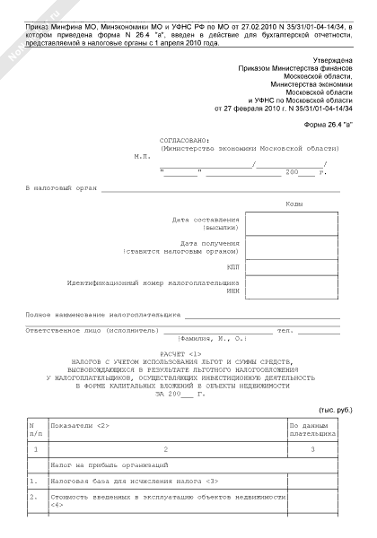 - 492Расчет налогов с учетом использования льгот и суммы средств, высвобождающихся в результате льготного налогообложения у налогоплательщиков, осуществляющих инвестиционную деятельность в форме капитальных вложений в объекты недвижимости Московской области. Форма № 26.4 «а»