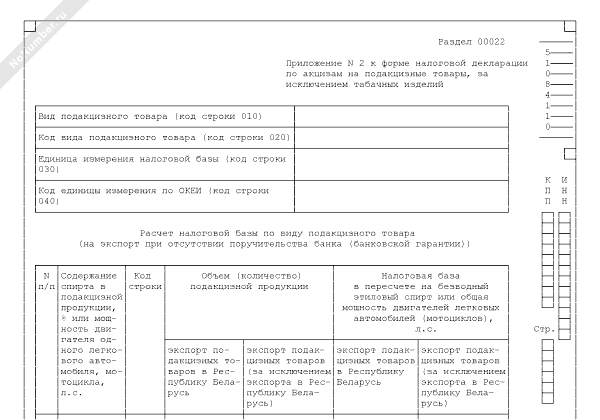 - 499Расчет налоговой базы по виду подакцизного товара (на экспорт при отсутствии поручительства банка (банковской гарантии)) (приложение к налоговой декларации по акцизам на подакцизные товары, за исключением табачных изделий)