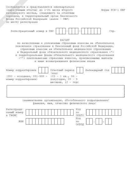 - 625Расчет по начисленным и уплаченным страховым взносам на обязательное пенсионное страхование в Пенсионный фонд Российской Федерации, страховым взносам на обязательное медицинское страхование в Федеральный фонд обязательного медицинского страхования и территориальные фонды обязательного медицинского страхования плательщиками страховых взносов, производящими выплаты и иные вознаграждения физическим лицам. Форма № РСВ-1 ПФР